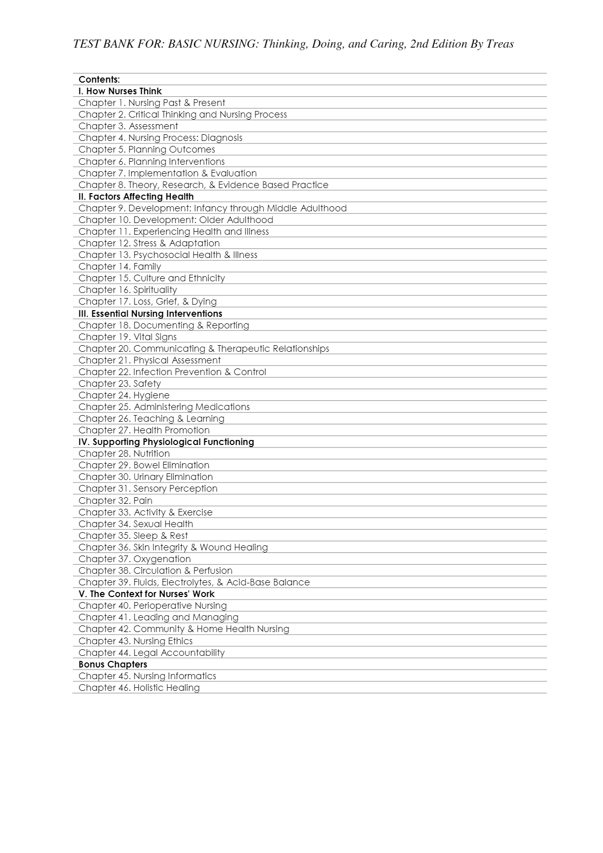 Test Bank for Basic Nursing: Thinking Doing and Caring 2nd Edition Treas